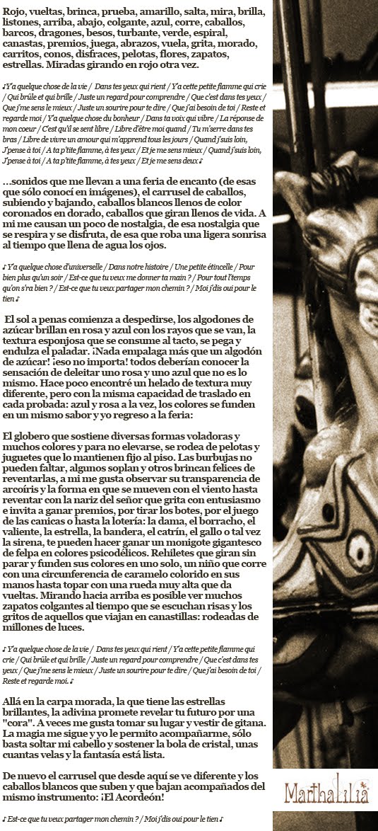 …y es que hay veces que si te quedas quieto sientes la sincronía. Otras tantas es mejor el movimiento, repetido y continuo que de algún modo se asemeja al silencio. El punto (ésta vez hablo de un punto color amarillo) es que hoy es un día de conexiones, hoy y todos, pero hoy se hizo consciente, y me parece que las ideas viajan entre tu mente y la mía, mientras se escapan por el vidrio roto de mi ventana. Salen en forma de esferas en distintos tonos de verde transparente que vuelan sobre mí, sobre Beto y la silla negra, pasando por la jaula de Eugenio. Se detienen a descansar sobre las hojas de mis plantas unos segundos para continuar enseguida su camino. Y así es, se cuelan por el vidrio roto y se dispersan con el aire. Son millones y todas en sí son una, conteniendo a la vez la misma y diferente información. ¿Me escuchas? Aquí y allá, en silencio y sin sonido, vuelan palabras que quiero decirte en éste preciso instante, formando recuerdos o deseos. A veces, simplemente un saludo sencillo que te pide que pienses en mí.